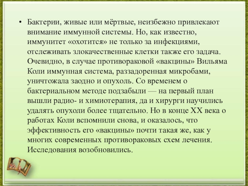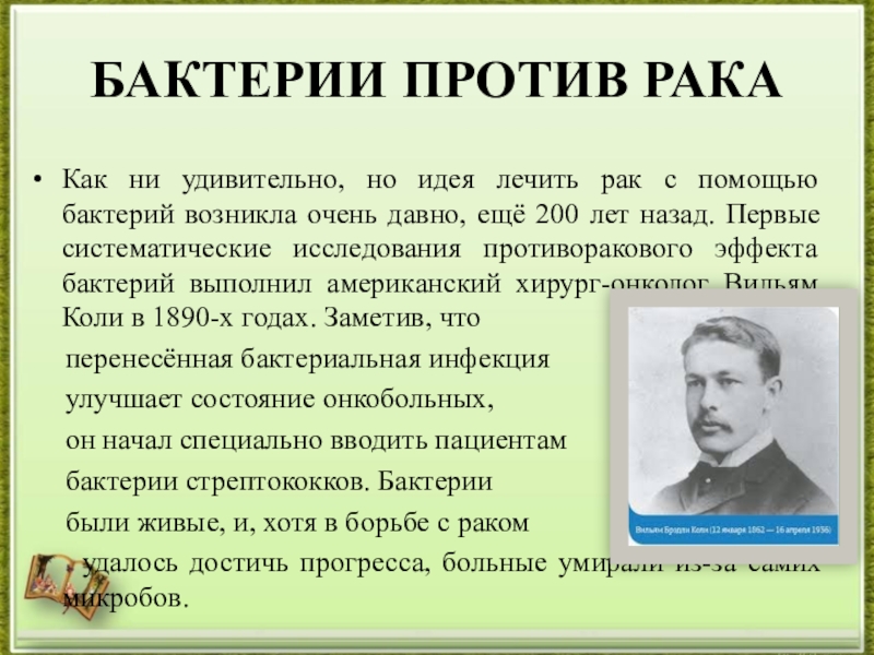 бактерий возникла очень давно, ещё 200 лет назад. Первые систематические исследования противоракового эффекта бактерий выполнил американский хирург-онколог Вильям Коли в 1890-х годах. Заметив, что
