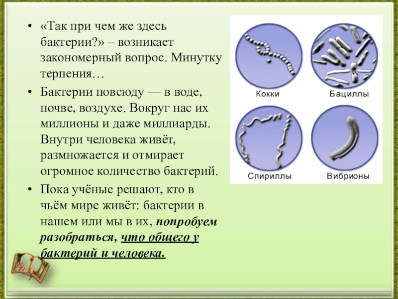 Слайд 6«Так при чем же здесь бактерии?» – возникает закономерный вопрос. Минутку