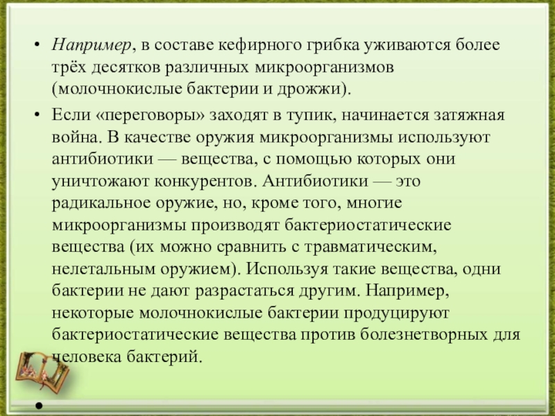 Слайд 8Например, в составе кефирного грибка уживаются более трёх десятков различных микроорганизмов