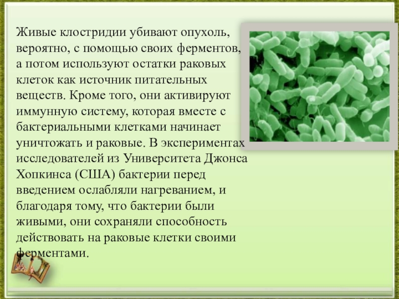 используют остатки раковых клеток как источник питательных веществ. Кроме того, они активируют иммунную систему, которая вместе с бактериальными клетками начинает уничтожать и раковые. В экспериментах исследователей из Университета Джонса Хопкинса (США) бактерии перед введением ослабляли нагреванием, и благодаря тому, что бактерии были живыми, они сохраняли способность действовать на раковые клетки своими ферментами.