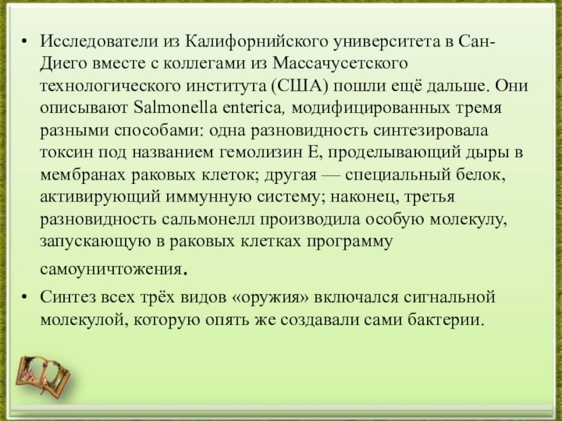 технологического института (США) пошли ещё дальше. Oни описывают Salmonella enterica, модифицированных тремя разными способами: одна разновидность синтезировала токсин под названиeм гемолизин Е, проделывающий дыры в мембранах раковых клеток; другая — специальный белок, активирующий иммунную систему; наконец, третья разновидность сальмонелл производила особую молекулу, запускающую в раковых клетках программу самоуничтожения.