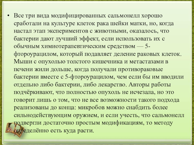 шейки матки, но, когда настал этап экспериментов с животными, оказалось, что бактерии дают лучший эффект, если использовать их с обычным химиотерапевтическим средством — 5-фтороурацилом, который подавляет деление раковых клеток. Мыши с опухолью толстого кишечника и метастазами в печени жили дольше, когда получали противораковые бактерии вместе с 5-фтороурацилом, чем если бы им вводили отдельно либо бактерии, либо лекарство. Авторы работы подчёркивают, что полностью опухоль не исчезала, но это говорит лишь о том, что не все возможности такого подхода реализованы до конца: микробов можно снабдить более сильнодействующим оружием, и если учесть, что сальмонелл подвергли достаточно простым модификациям, то методу определённо есть куда расти.