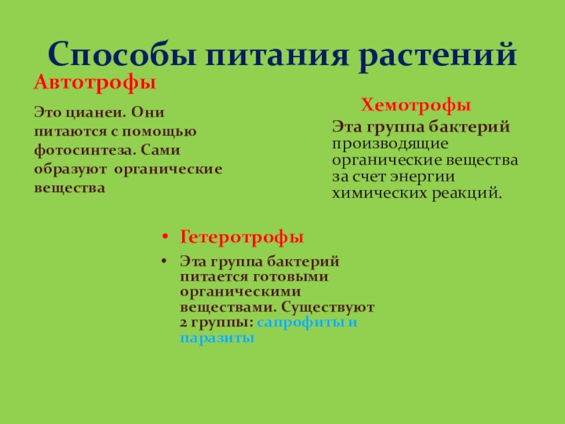 Эта группа бактерий питается готовыми органическими веществами. Существуют 2 группы: сапрофиты и паразиты