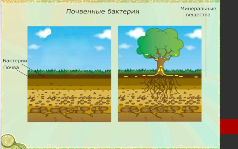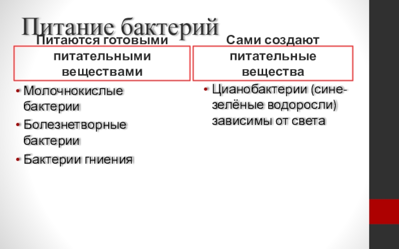 Питание бактерийПитаются готовыми питательными веществамиМолочнокислые бактерииБолезнетворные бактерииБактерии гниенияСами создают питательные веществаЦианобактерии (сине-зелёные водоросли) зависимы от света