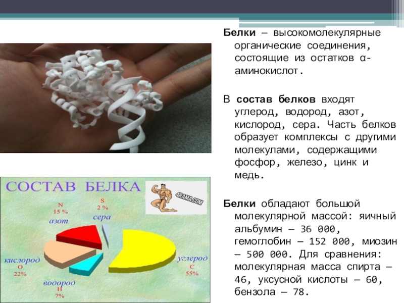 Белки обладают большой молекулярной массой: яичный альбумин — 36 000, гемоглобин — 152 000, миозин — 500 000. Для сравнения: молекулярная масса спирта — 46, уксусной кислоты — 60, бензола — 78.