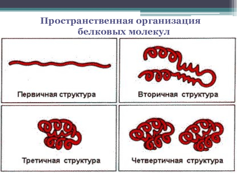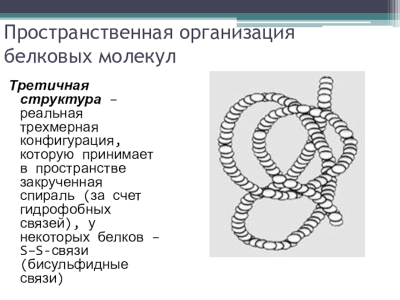 пространстве закрученная спираль (за счет гидрофобных связей), у некоторых белков – S–S-связи (бисульфидные связи)