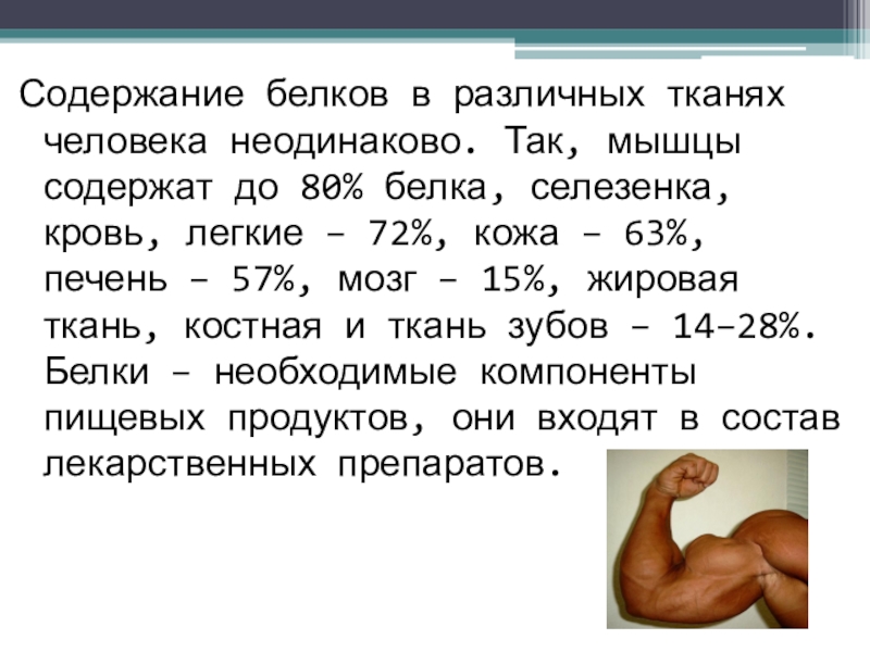 Слайд 21Содержание белков в различных тканях человека неодинаково. Так, мышцы содержат до