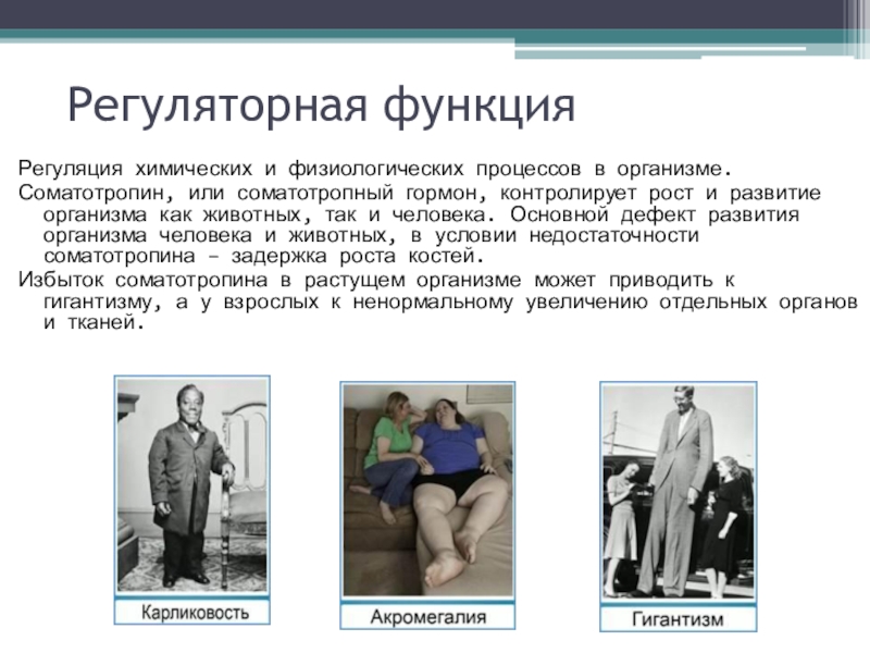 контролирует рост и развитие организма как животных, так и человека. Основной дефект развития организма человека и животных, в условии недостаточности соматотропина – задержка роста костей.