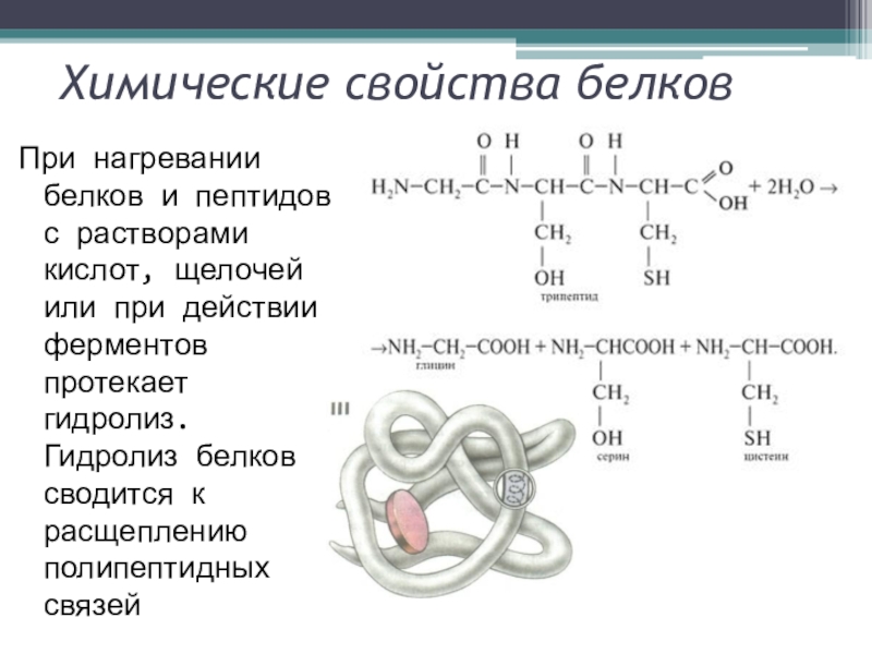 или при действии ферментов протекает гидролиз. Гидролиз белков сводится к расщеплению полипептидных связей