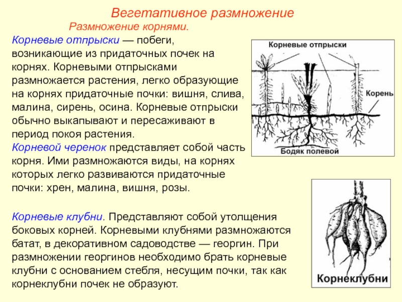 Корневые клубни. Представляют собой утолщения боковых корней. Корневыми клубнями размножаются батат, в декоративном садоводстве — георгин. При размножении георгинов необходимо брать корневые клубни с основанием стебля, несущим почки, так как корнеклубни почек не образуют.