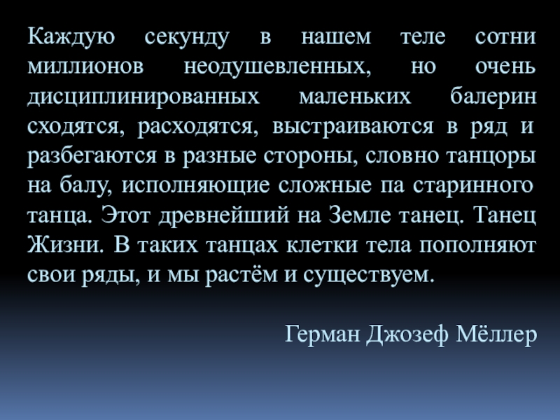 маленьких балерин сходятся, расходятся, выстраиваются в ряд и разбегаются в разные стороны, словно танцоры на балу, исполняющие сложные па старинного танца. Этот древнейший на Земле танец. Танец Жизни. В таких танцах клетки тела пополняют свои ряды, и мы растём и существуем.