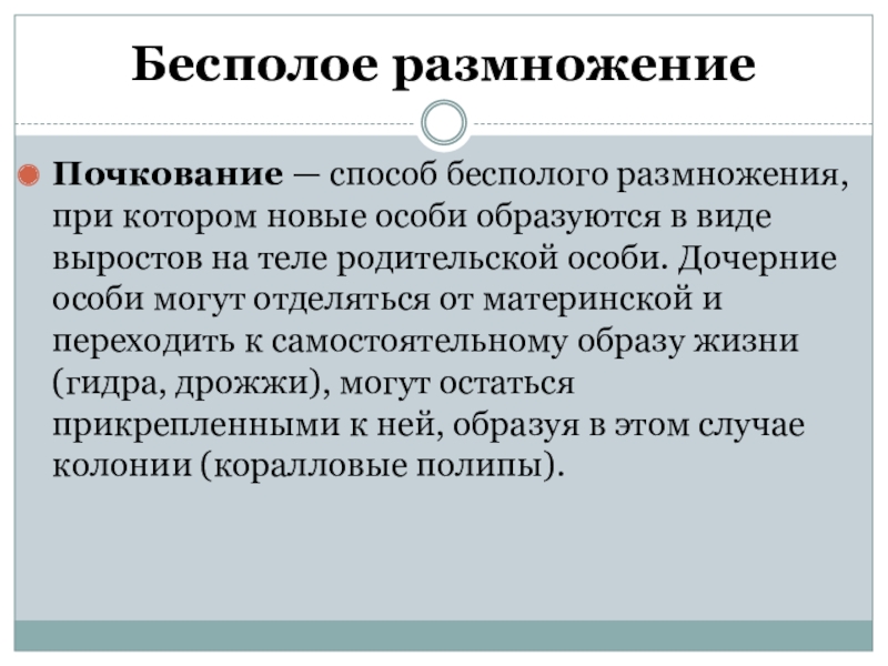 Бесполое размножениеПочкование — способ бесполого размножения, при котором новые особи образуются в виде выростов на теле родительской особи.