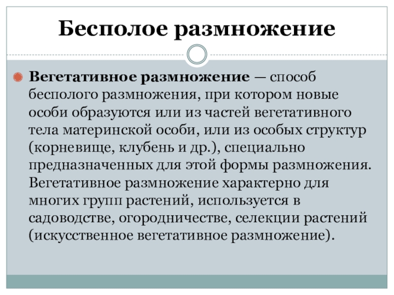 Бесполое размножениеВегетативное размножение — способ бесполого размножения, при котором новые особи образуются или из частей вегетативного тела материнской