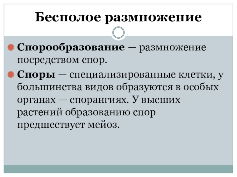Бесполое размножениеСпорообразование — размножение посредством спор. Споры — специализированные клетки, у большинства видов образуются в особых органах — спорангиях. У