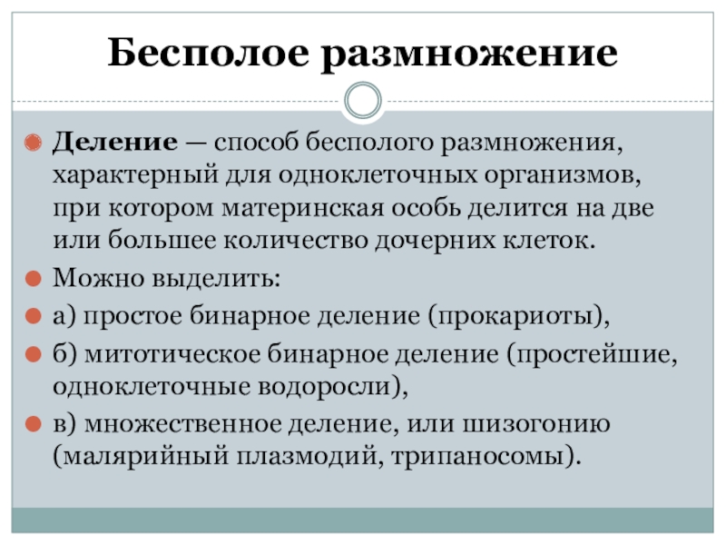 Бесполое размножениеДеление — способ бесполого размножения, характерный для одноклеточных организмов, при котором материнская особь делится на две или