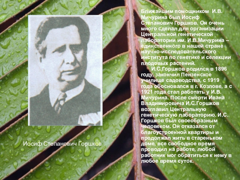 Слайд 19Ближайшим помощником И.В.Мичурина был Иосиф Степанович Горшков. Он очень много сделал