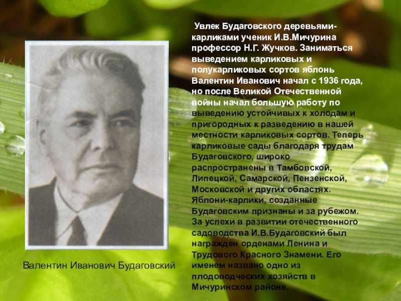 Жучков. Заниматься выведением карликовых и полукарликовых сортов яблонь Валентин Иванович начал с 1936 года, но после Великой Отечественной войны начал большую работу по выведению устойчивых к холодам и пригородных к разведению в нашей местности карликовых сортов. Теперь карликовые сады благодаря трудам Будаговского, широко распространены в Тамбовской, Липецкой, Самарской, Пензенской, Московской и других областях. Яблони-карлики, созданные Будаговским признаны и за рубежом. За успехи в развитии отечественного садоводства И.В.Будаговский был награжден орденами Ленина и Трудового Красного Знамени. Его именем названо одно из плодоводческих хозяйств в Мичуринском районе.