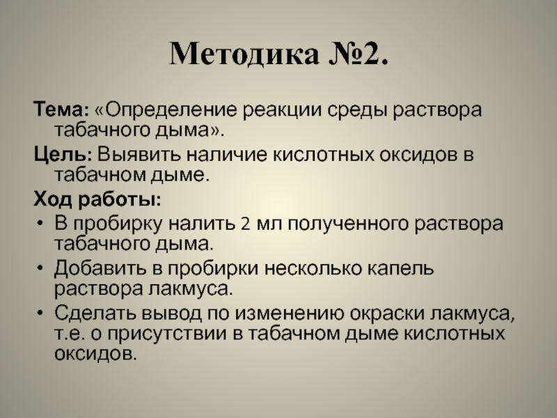 Слайд 25Используя методику №2, мы определили среду раствора табачного дыма. В данном