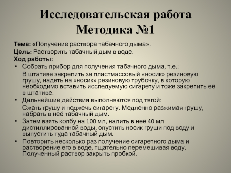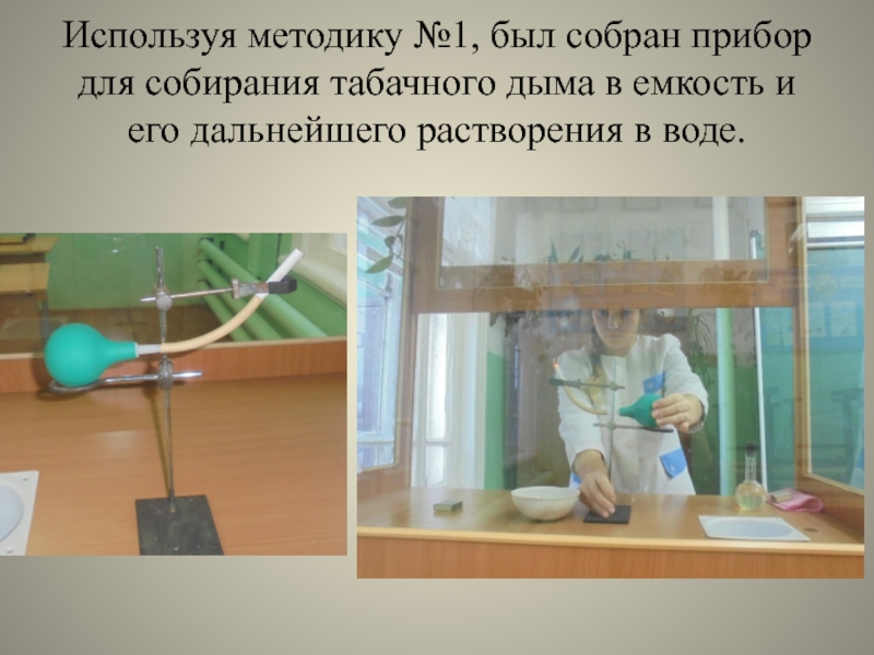 Слайд 24Используя методику №1, был собран прибор для собирания табачного дыма в