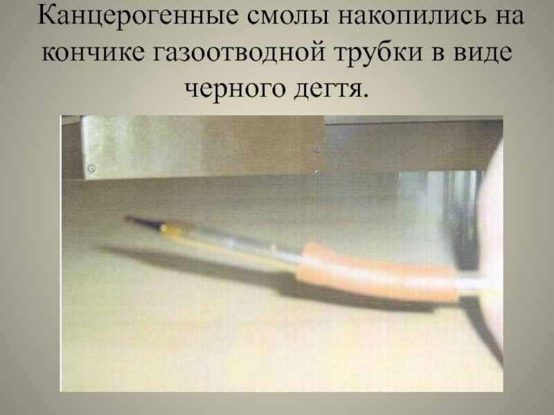 Слайд 31Канцерогенные смолы накопились на кончике газоотводной трубки в виде черного дегтя.