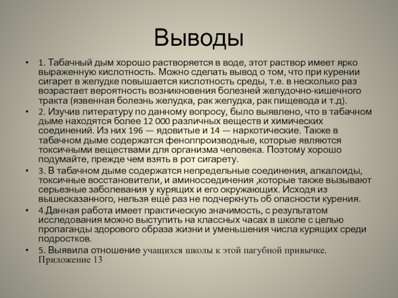4.Данная работа имеет практическую значимость, с результатом исследования можно выступить на классных часах в школе с целью пропаганды здорового образа жизни и уменьшения числа курящих среди подростков.