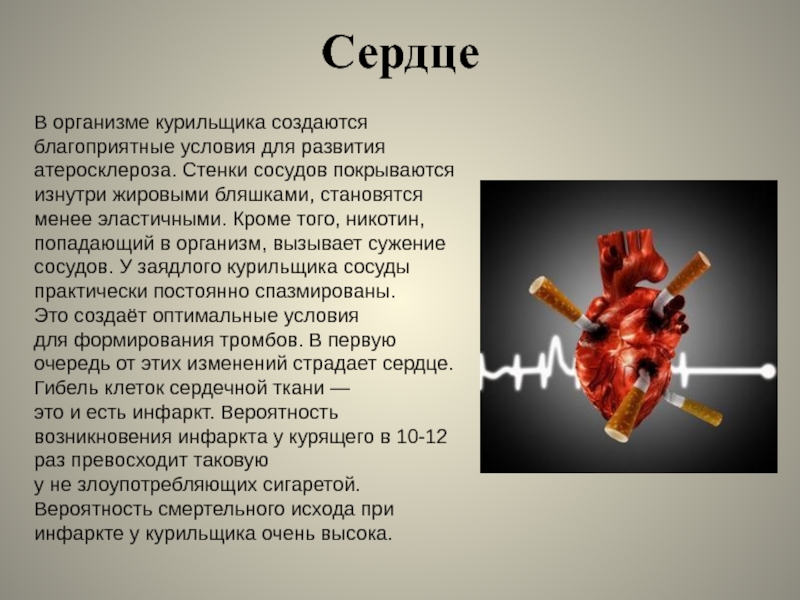 изнутри жировыми бляшками, становятся менее эластичными. Кроме того, никотин, попадающий в организм, вызывает сужение сосудов. У заядлого курильщика сосуды практически постоянно спазмированы. Это создаёт оптимальные условия для формирования тромбов. В первую очередь от этих изменений страдает сердце. Гибель клеток сердечной ткани — это и есть инфаркт. Вероятность возникновения инфаркта у курящего в 10-12 раз превосходит таковую у не злоупотребляющих сигаретой.