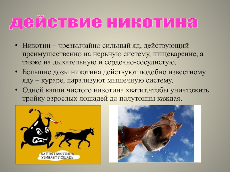 Одной капли чистого никотина хватит,чтобы уничтожить тройку взрослых лошадей до полутонны каждая.