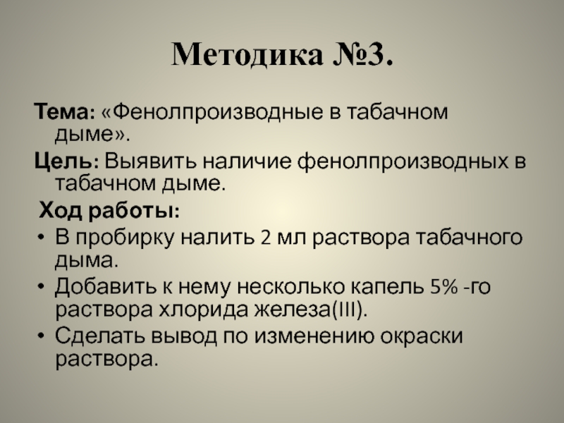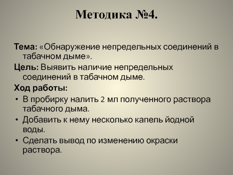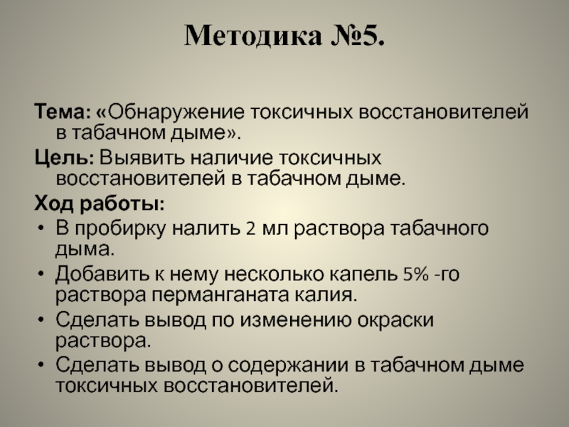 Слайд 28Используя методику №5, было выявлено, что в табачном дыме содержатся токсичные
