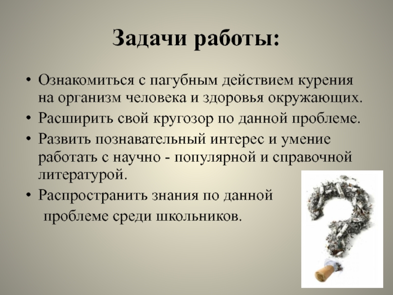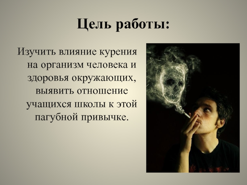Изучить влияние курения на организм человека и здоровья окружающих, выявить