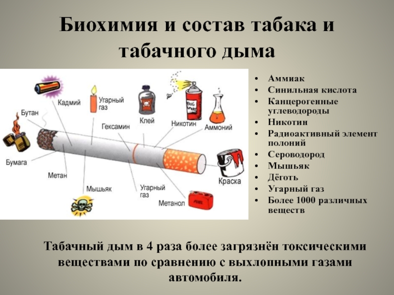 Табачный дым в 4 раза более загрязнён токсическими веществами по сравнению с выхлопными газами автомобиля.