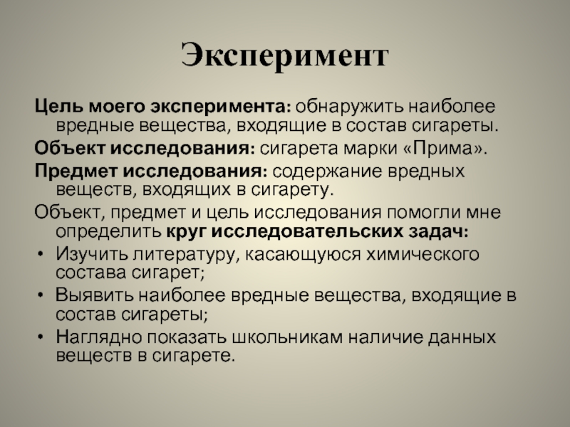 Предмет исследования: содержание вредных веществ, входящих в сигарету.