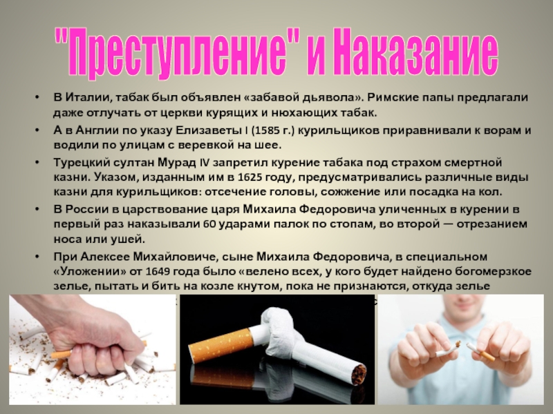 А в Англии по указу Елизаветы I (1585 г.) курильщиков приравнивали к ворам и водили по улицам с веревкой на шее.