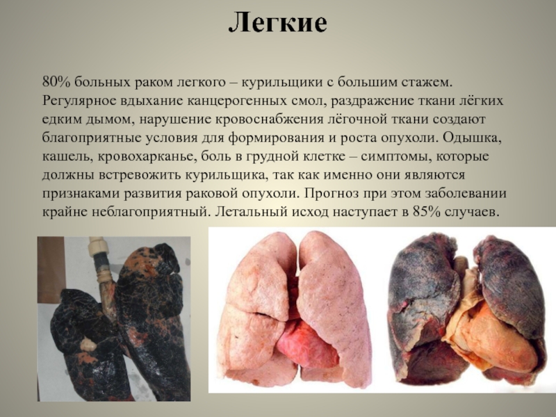 80% больных раком легкого – курильщики с большим стажем. Регулярное вдыхание канцерогенных смол, раздражение
