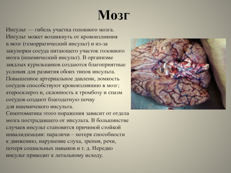 и из-за закупорки сосуда питающего участок головного мозга (ишемический инсульт). В организме заядлых курильщиков создаются благоприятные условия для развития обоих типов инсульта. Повышенное артериальное давлени, ломкость сосудов способствуют кровоизлиянию в мозг; атеросклероз и, склонность к тромбозу и спазм сосудов создают благодатную почву для ишемичского инсульта.