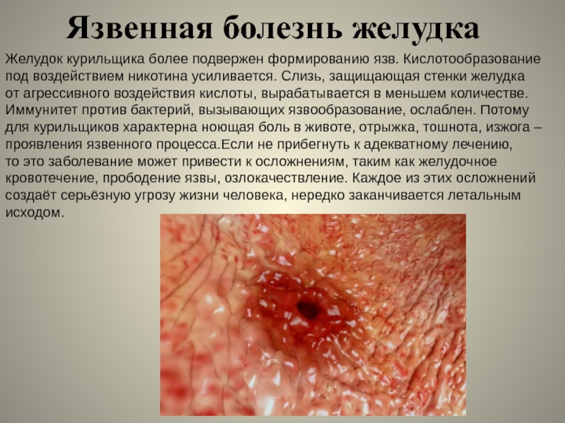 усиливается. Слизь, защищающая стенки желудка от агрессивного воздействия кислоты, вырабатывается в меньшем количестве. Иммунитет против бактерий, вызывающих язвообразование, ослаблен. Потому для курильщиков характерна ноющая боль в животе, отрыжка, тошнота, изжога – проявления язвенного процесса.Если не прибегнуть к адекватному лечению, то это заболевание может привести к осложнениям, таким как желудочное кровотечение, прободение язвы, озлокачествление. Каждое из этих осложнений создаёт серьёзную угрозу жизни человека, нередко заканчивается летальным исходом.