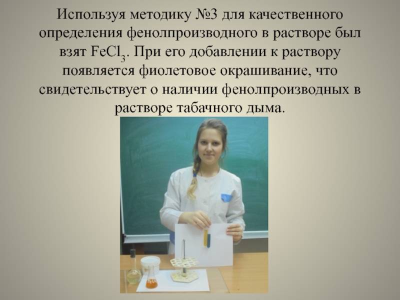 Слайд 26Используя методику №3 для качественного определения фенолпроизводного в растворе был взят FeCl3.
