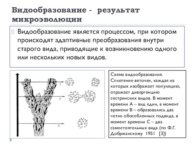 Схема видообразования. Сплетение веточек, каждая из которых изображает популяцию, отражает дивергенцию сестринских видов. В момент времени А – вид един, в момент времени В – образовались два четко обособленных подвида, в момент времени С – два самостоятельных вида (по Ф.Г. Добржанскому 1951 [3])