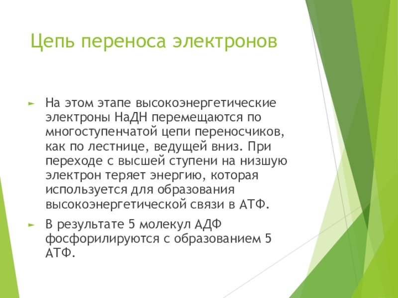 цепи переносчиков, как по лестнице, ведущей вниз. При переходе с высшей ступени на низшую электрон теряет энергию, которая используется для образования высокоэнергетической связи в АТФ.