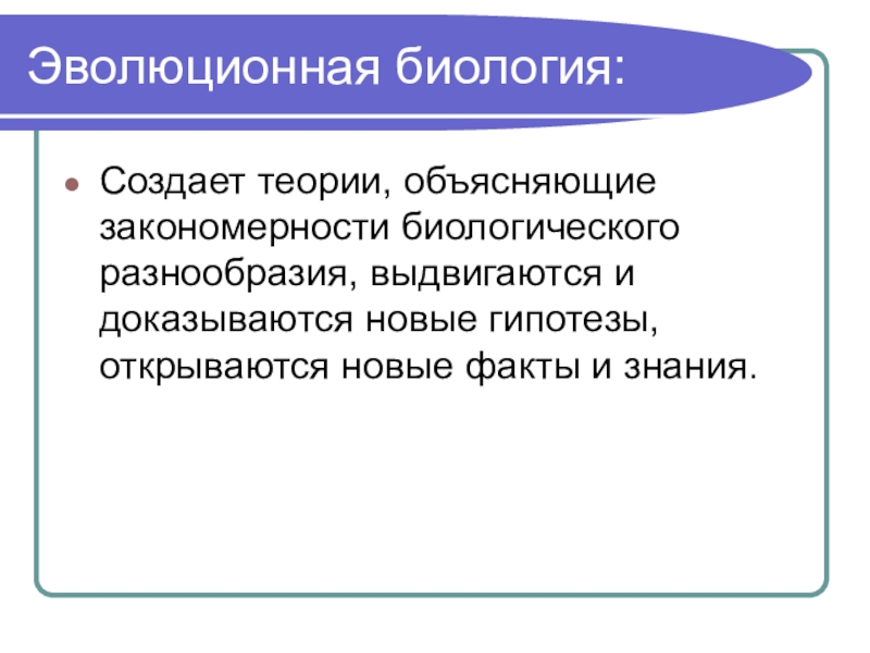 Эволюционная биология:Создает теории, объясняющие закономерности биологического разнообразия, выдвигаются и доказываются новые гипотезы, открываются новые факты и знания.
