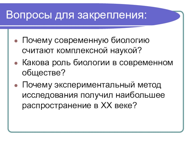 Вопросы для закрепления:Почему современную биологию считают комплексной наукой?Какова роль биологии в современном обществе?Почему экспериментальный метод исследования получил