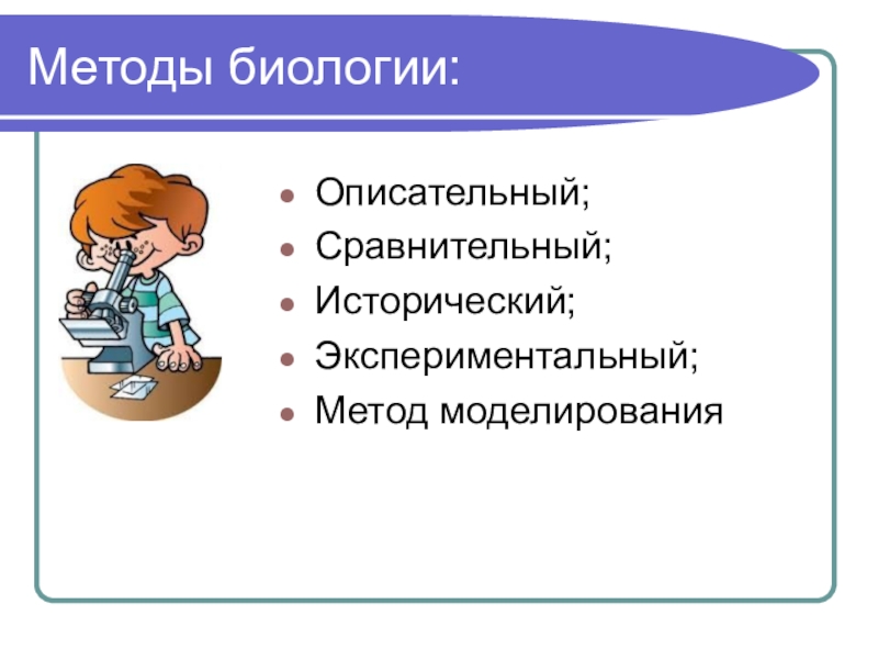 Методы биологии:Описательный;Сравнительный;Исторический;Экспериментальный;Метод моделирования