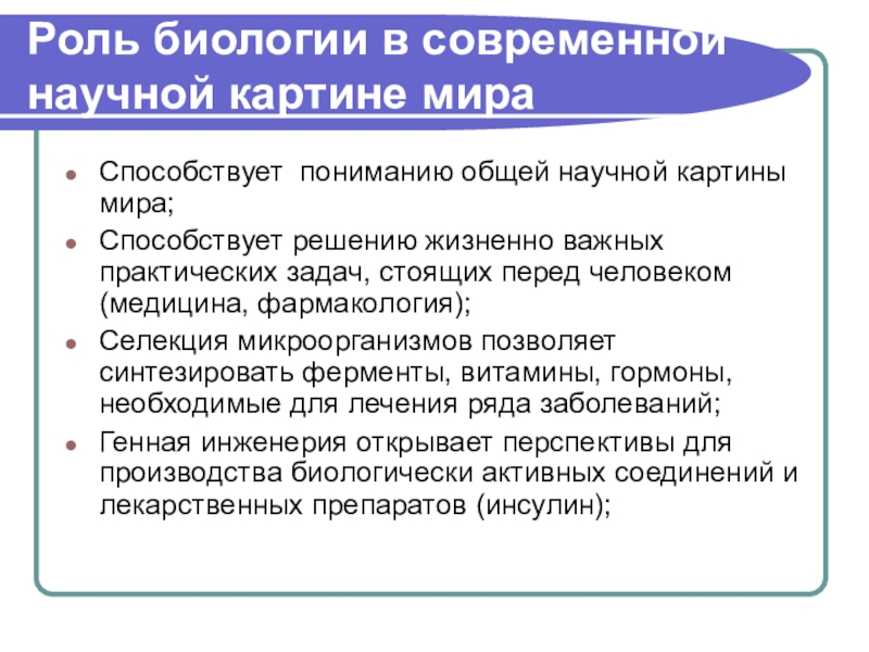 Роль биологии в современной научной картине мираСпособствует пониманию общей научной картины мира;Способствует решению жизненно важных практических задач,