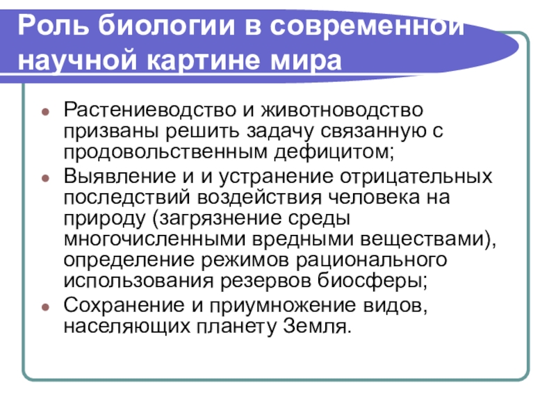 Роль биологии в современной научной картине мираРастениеводство и животноводство призваны решить задачу связанную с продовольственным дефицитом;Выявление и