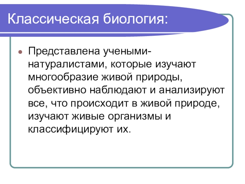 Классическая биология:Представлена учеными-натуралистами, которые изучают многообразие живой природы, объективно наблюдают и анализируют все, что происходит в живой