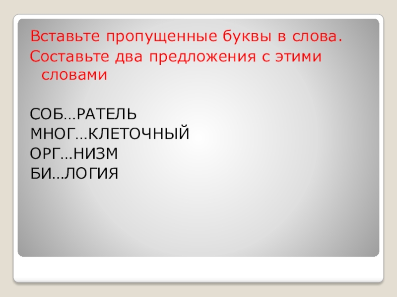 Вставьте пропущенные буквы в слова.Составьте два предложения с этими словамиСОБ…РАТЕЛЬМНОГ…КЛЕТОЧНЫЙОРГ…НИЗМБИ…ЛОГИЯ
