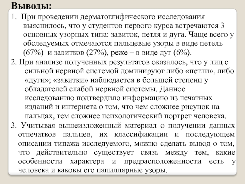 2. При анализе полученных результатов оказалось, что у лиц с сильной нервной системой доминируют либо «петли», либо «дуги»; «завитки» наблюдается в большей степени у обладателей слабой нервной системы. Данное исследованию подтвердило информацию из печатных изданий и интернета о том, что чем сложнее рисунок на пальцах, тем сложнее психологический портрет человека.