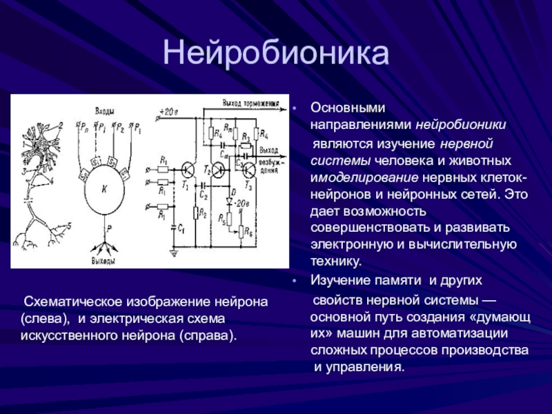 Схематическое изображение нейрона (слева), и электрическая схема искусственного нейрона (справа).