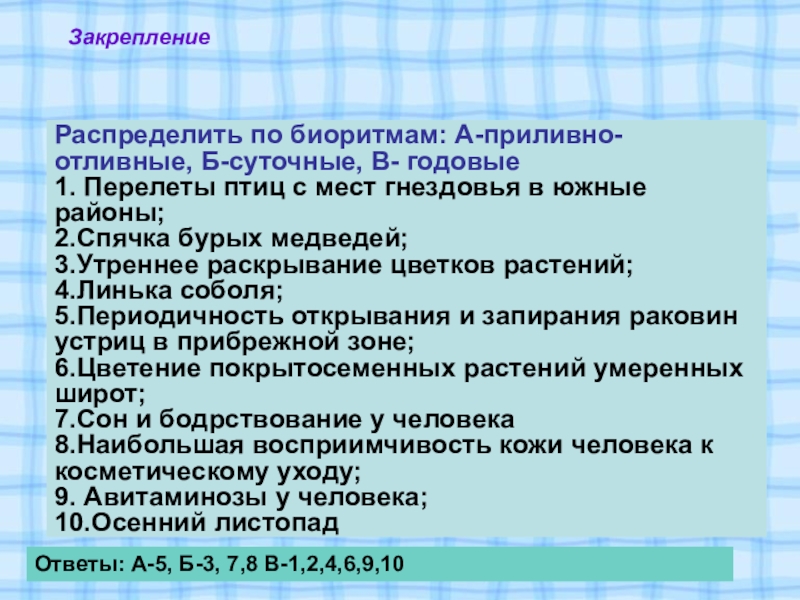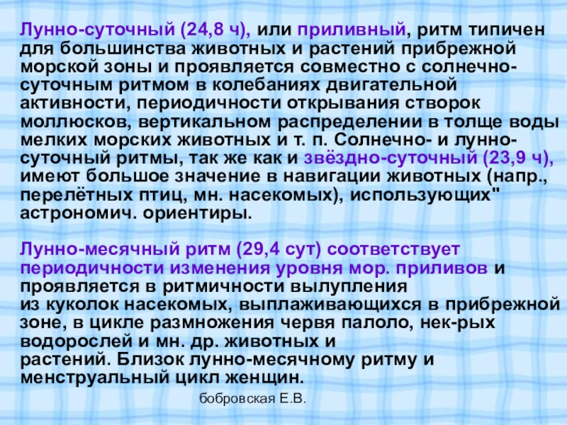 Адаптивные биоритмы – (суточные, приливно-отливные, равные лунному месяцу, годичные) возникли как приспособление физиологии живых существ к регулярным экологическим изменениям во внешней среде.
