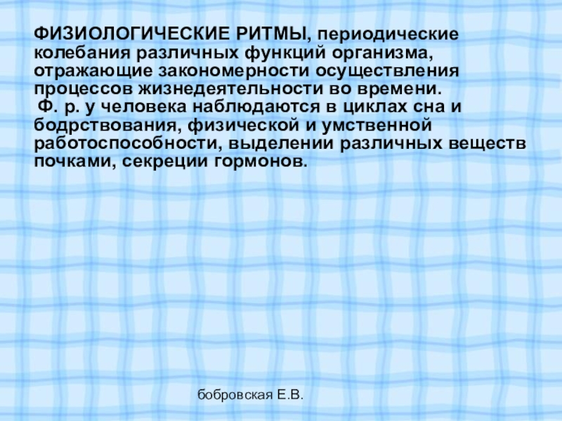 Физиологические ритмы -поддерживают непрерывную жизнедеятельность организмов(биение сердца, дыхание, работа желез внутр.секреции, ритмичность стенок кишечника и т.д.)