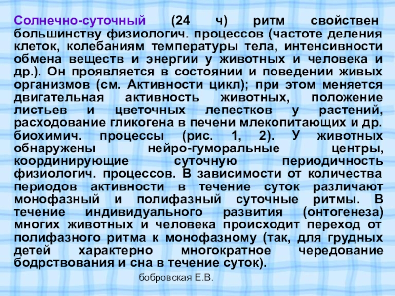 с приспособлением организмов к геофизическим циклам — солнечно-суточным (напр., колебания интенсивности деления клеток, обмена веществ, двигательной активности животных), приливным (напр., биологические процессы у организмов, связанные с уровнем морских приливов), годичным (изменение численности и активности животных, роста и развития растений и др.).